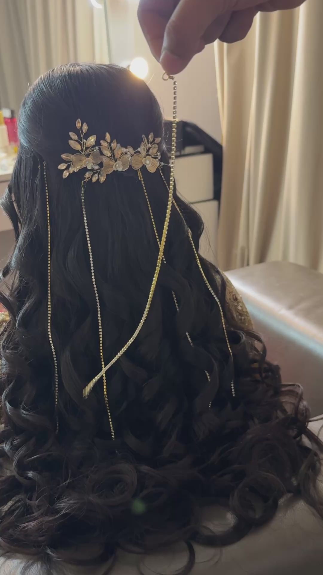 Elegant rhinestone chain strands designed to add a flowing sparkle to buns, braids, or open hairstyles.